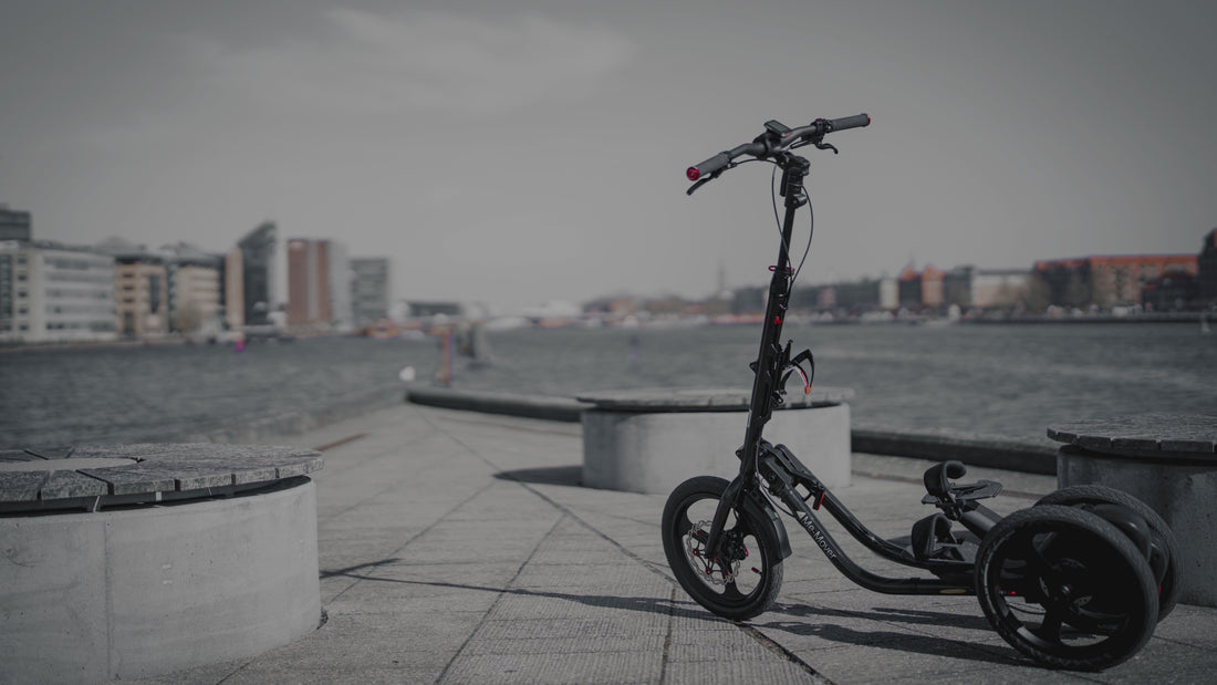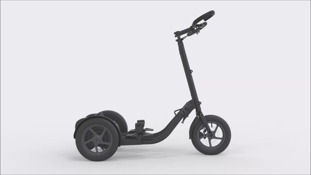 Thanks to its three-wheel design, the Me-Mover is very stable and easier to balance than a bicycle. You can stay standing even when fully stopped—no need to put a foot on the ground.