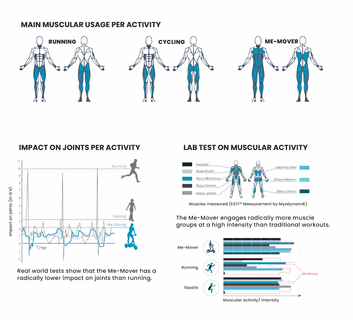 The Me-Mover activates more muscles than running or cycling, giving you a true full-body workout every time you step outside. It engages your core, legs, back, and upper body simultaneously, helping you build strength and stability with every movement. Unlike running, the Me-Mover keeps impact on your joints remarkably low, allowing you to train harder while protecting your knees, hips, and ankles. Lab tests show that the Me-Mover delivers higher muscular intensity across more muscle groups than traditional exercises. This means you get more results in less time — all while enjoying the fresh air outdoors. It’s a workout that feels natural, fluid, and empowering. Whether you’re aiming for fitness, rehabilitation, or pure enjoyment, the Me-Mover transforms movement into momentum. Feel the difference, feel the freedom — move your body the way it was designed to move.